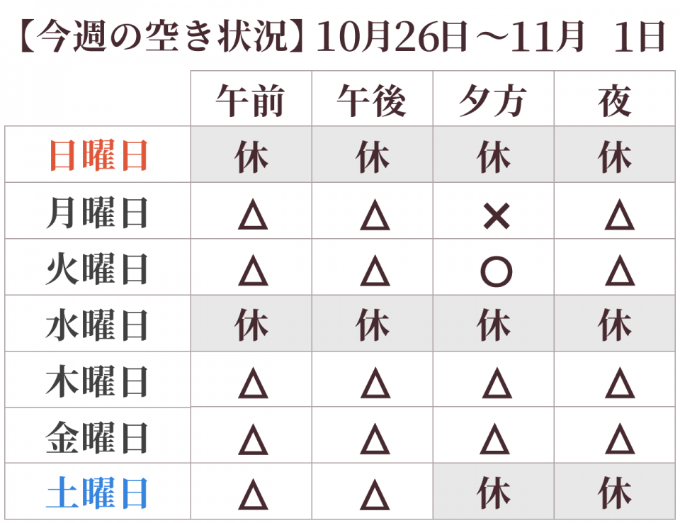 ※空き状況:◯=空きあり/△=残りわずか/×=満席