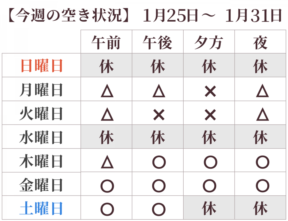 ・ご予約の際は、希望の日時・時間帯(午前・午後・夕方・夜)を3つお知らせください。