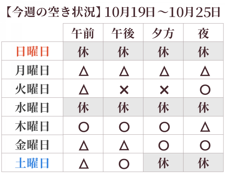 ※空き状況:◯=空きあり/△=残りわずか/×=満席