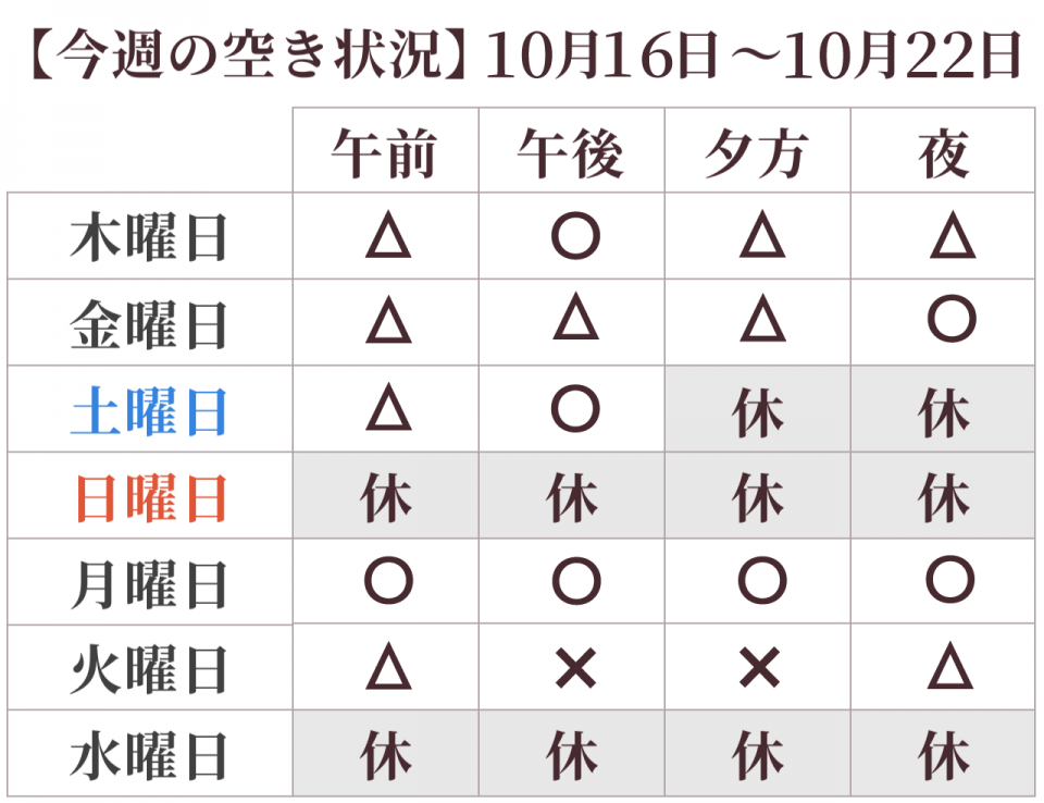 ※空き状況:◯=空きあり/△=残りわずか/×=満席