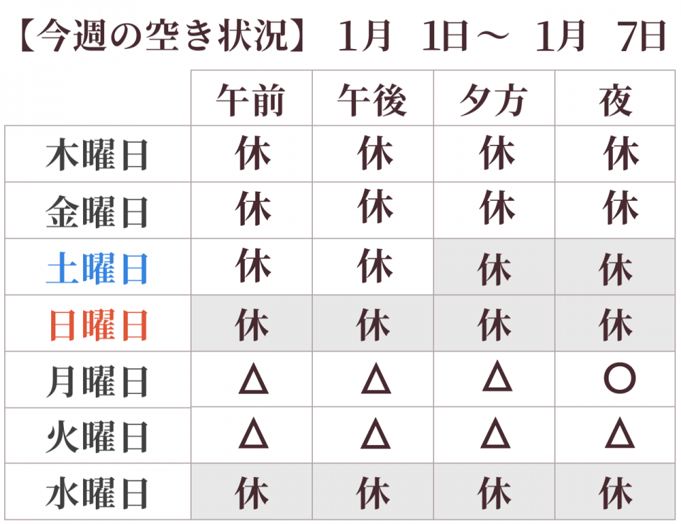・ご予約の際は、希望の日時・時間帯(午前・午後・夕方・夜)を3つお知らせください。