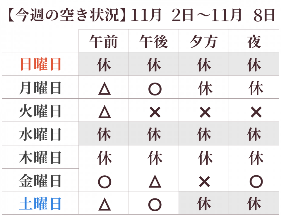 ※空き状況:◯=空きあり/△=残りわずか/×=満席