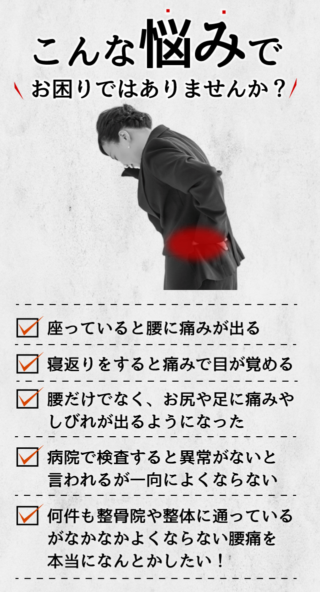 腰痛で悩んでいるあなたはきっとこんな思いがないでしょうか?