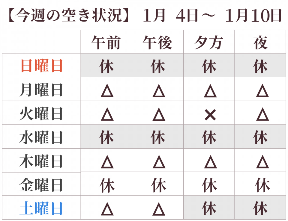 ・ご予約の際は、希望の日時・時間帯(午前・午後・夕方・夜)を3つお知らせください。