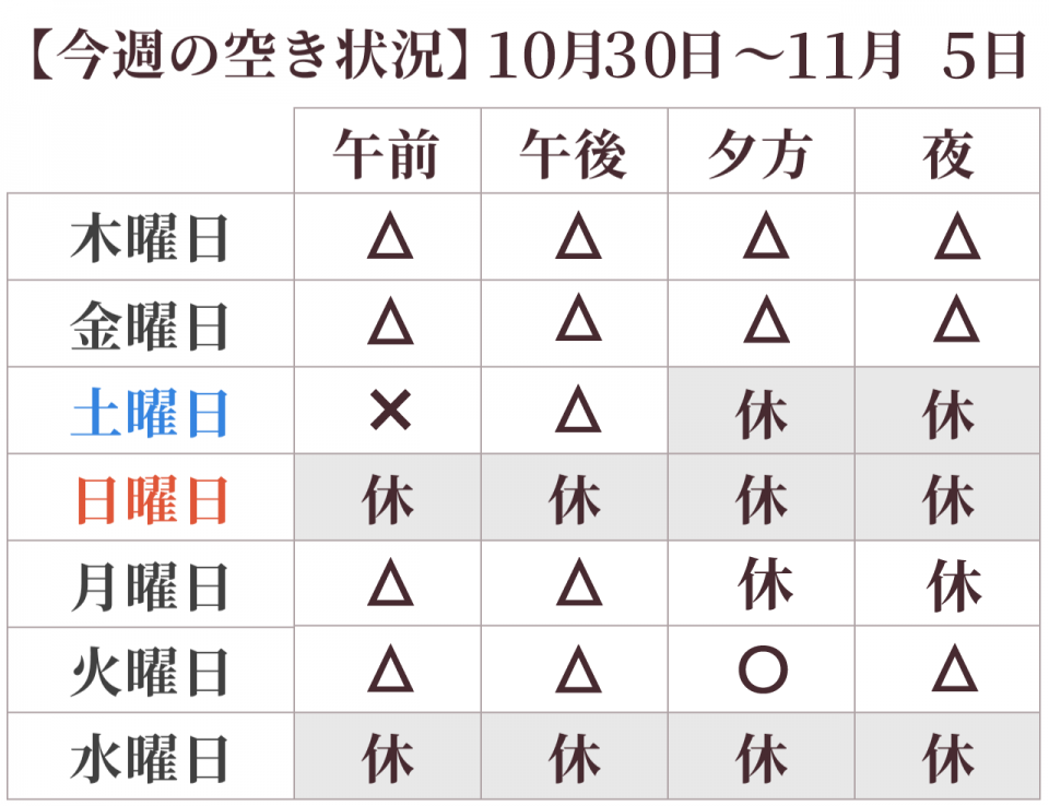 ※空き状況:◯=空きあり/△=残りわずか/×=満席